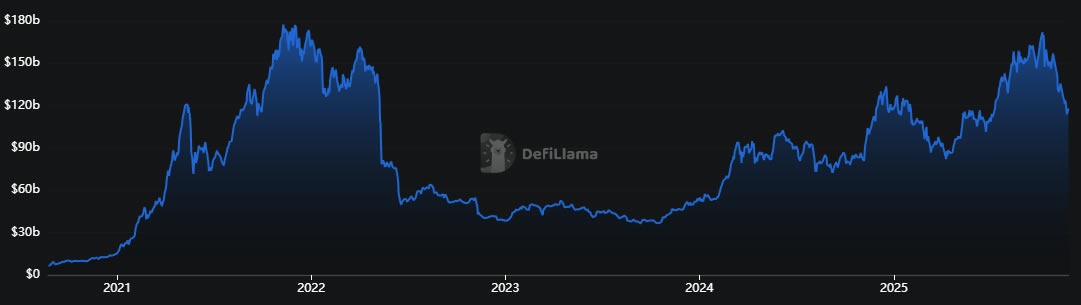 DeFi TVL is down 33% from its all-time high in 2021. sauce: Defilama