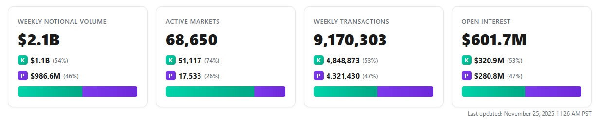Current forecast market statistics for Kalshi and Polymarket. sauce: DeFi rate