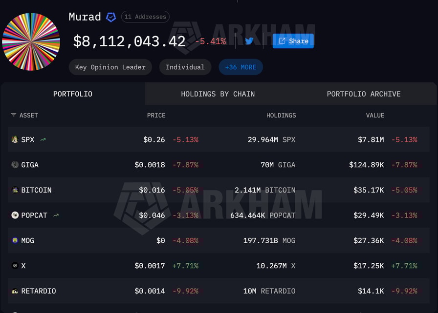 Makhmudov’s publicly labeled wallet, tracked by Arkham Intelligence under the entity “Must Stop Murad,” currently holds approximately 29,964,000 SPX (valued at approximately $7.79 million).