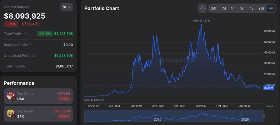 The decline since then equates to approximately $60 million in unrealized losses, as the broader memecoin sector, including SPX, has corrected more than 80% from its highs.