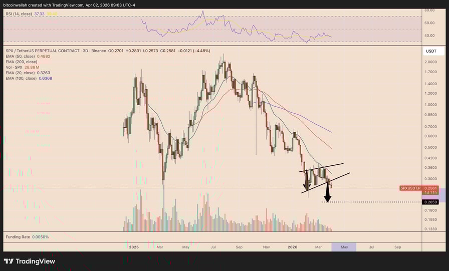 SPX has already started to lose the lower wedge trendline around $0.26 and remains below the 20-period, 50-period, and 100-period exponential moving averages, highlighting weak momentum.
