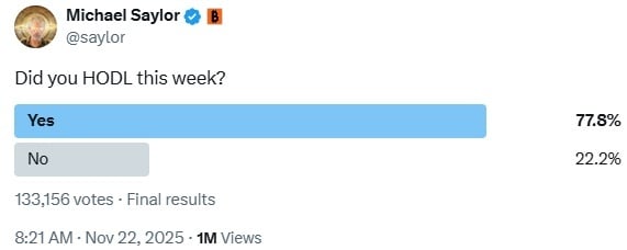 “Did you HODL this week?” started the poll and became popular as Bitcoin fell toward a major support zone earlier in the week. The decline spooked traders, and the price briefly fell to the low $80,000s, before rebounding to near $86,550. Despite the confusion, 77.8% of 133,156 respondents selected “yes.” This reaction suggests that many users held onto their positions during the recession rather than exiting, even though the daily chart showed sustained weakness.