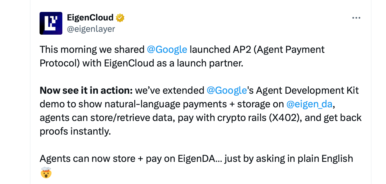 EIGEN’s adoption of x402 is tailored to the agent economy, allowing autonomous agents to work with on-chain and off-chain systems and process payments on their own, enabling razor-thin pay-as-you-go pricing that drills down to a fraction of the price, such as $0.001 per request.